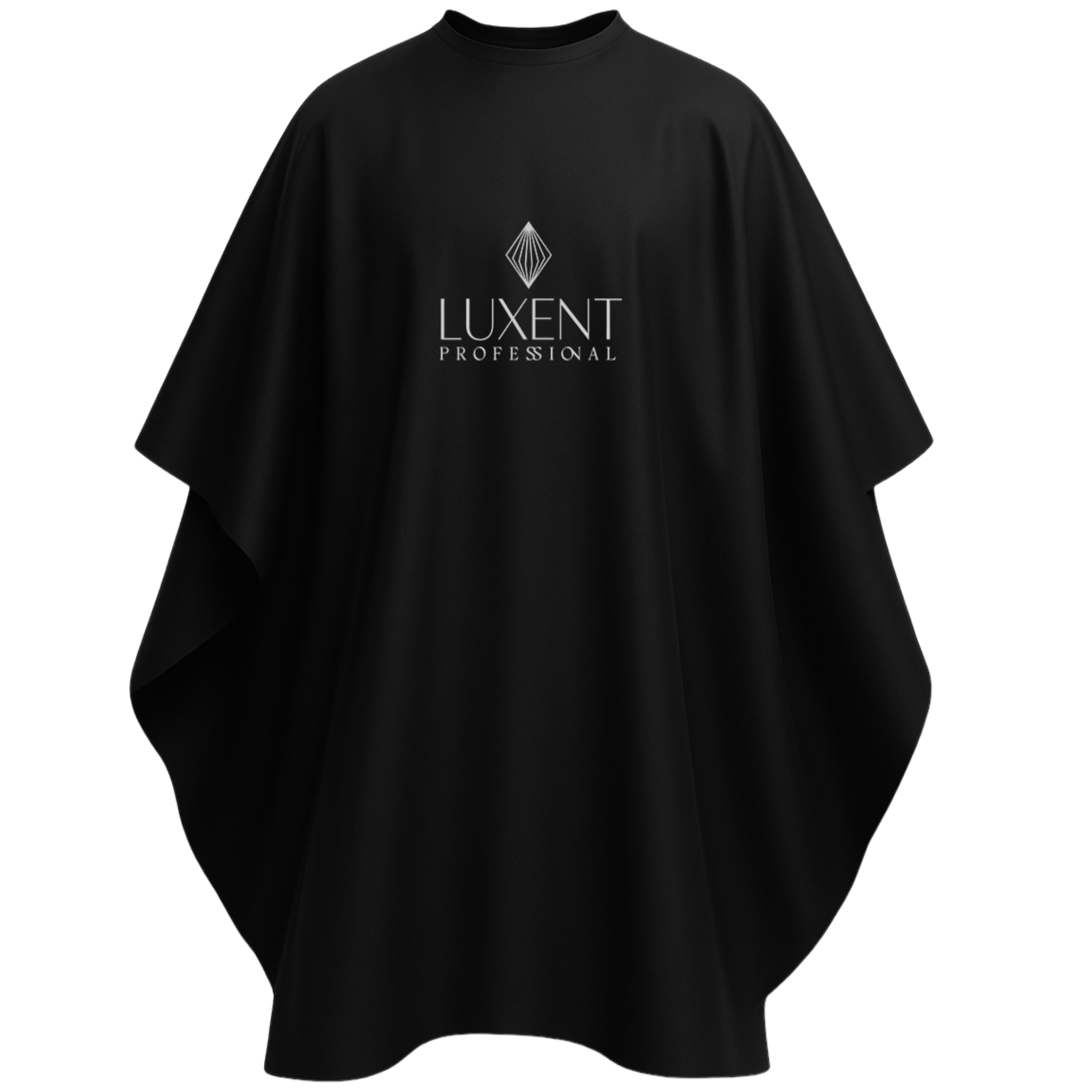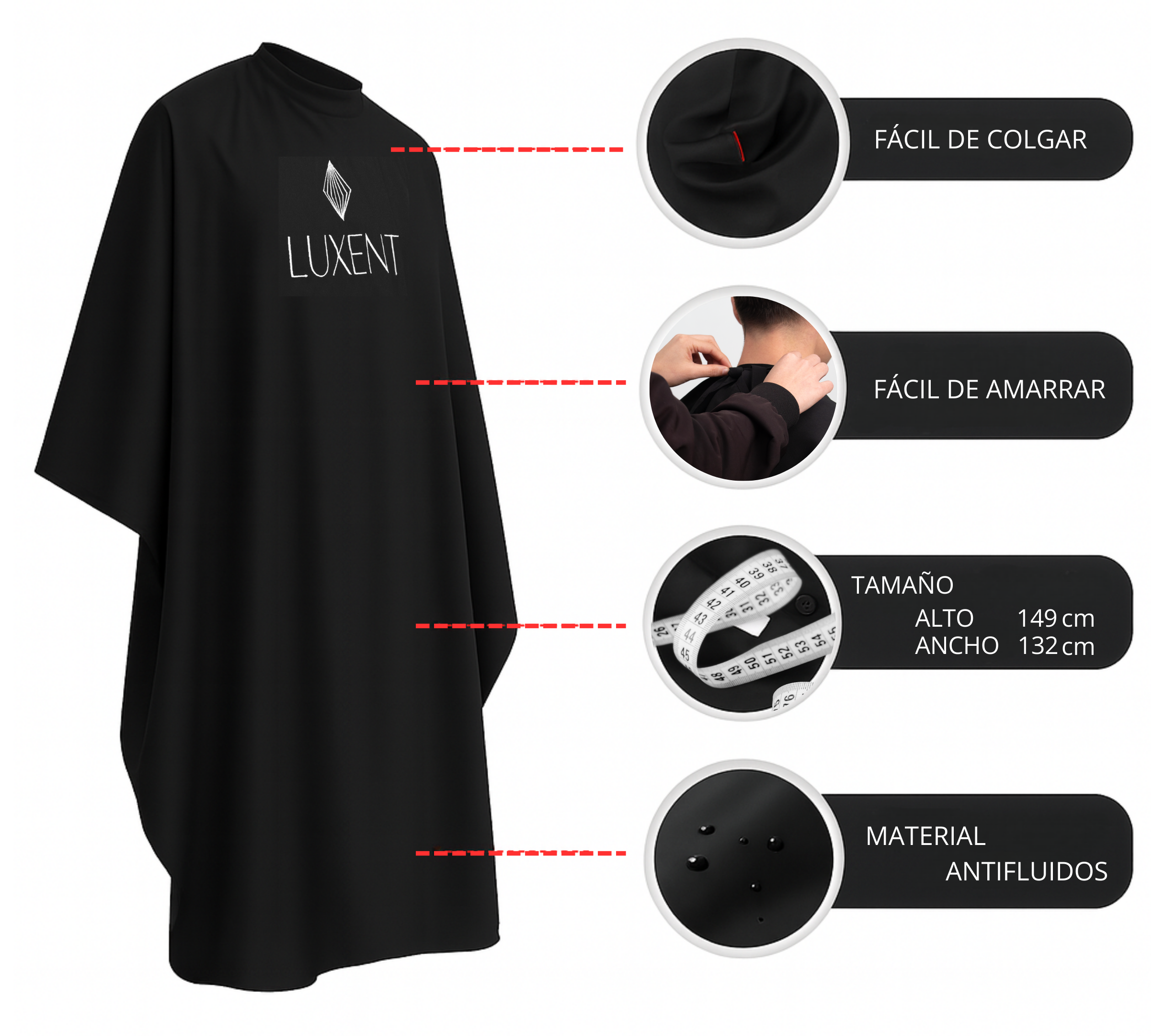 La capa antifluido Luxent está fabricada con material de alta resistencia y calidad , diseñada para repeler líquidos y proteger al cliente durante cortes, decoloraciones y cambios de color .