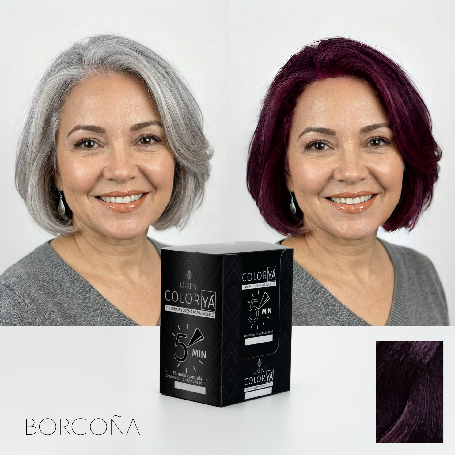 2. Presentado en 7 colores: Negro, Castaño Oscuro, Gris Humo, Borgoña, Rubio, Chocolate y Cataño Claro